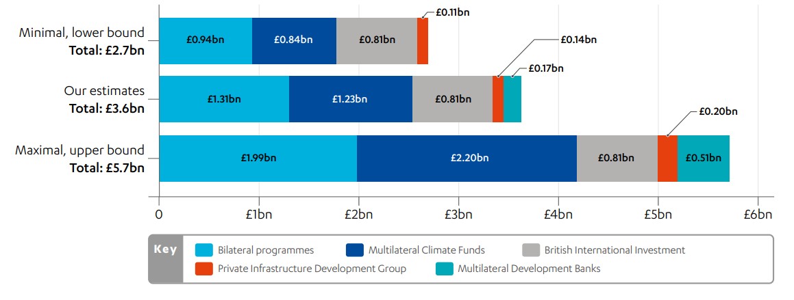 Some of the programmes and activities in this portfolio have clean energy as their primary focus, some do not have an energy focus but are relevant to the wider energy transition, while others include clean energy alongside other ICF pillar priorities. Based on an analysis and estimates of this ICF pillar breakdown, as well as the delivery channels of the support, our best estimate is that the UK will spend around £3.6 billion of official development assistance (ODA) on supporting energy transition in developing countries over the five years 2021-22 to 2025-26 (within a total budget for the 84 relevant programmes and activities of £5.7 billion, and a total for ICF of £11.6 billion).