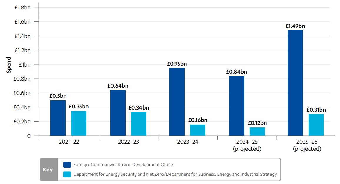 The UK has also been central to the creation of several different international alliances bringing developed and developing countries together to promote energy transition in the last five years. These range from the Clean Energy Transition Partnership launched at the Glasgow Climate Summit in 2021 to the Global Clean Power Alliance launched at the G20 in 2024. While the alliances themselves are not aid-funded, developing country members of alliances will often rely on aid funding to be able to commit to the alliances’ objectives.