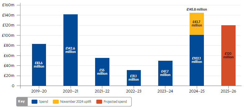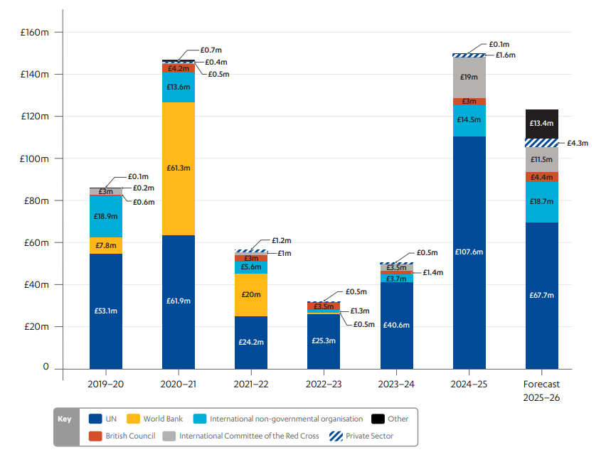 * Bilateral spend for education is not included in the chart, since it represents too small a proportion of overall spend to be visible (£6,264 in 2024–25 and £39,600 forecasted for 2025–26). Figures for 2025–2026 are forecasted.